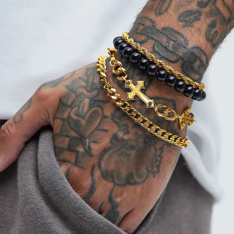 Retro Stainless Steel Cross Balck Beads Multi-layer Bracelet Hip Hop Silver Color Men Bracelet INS Jewelry Trendy Accessories