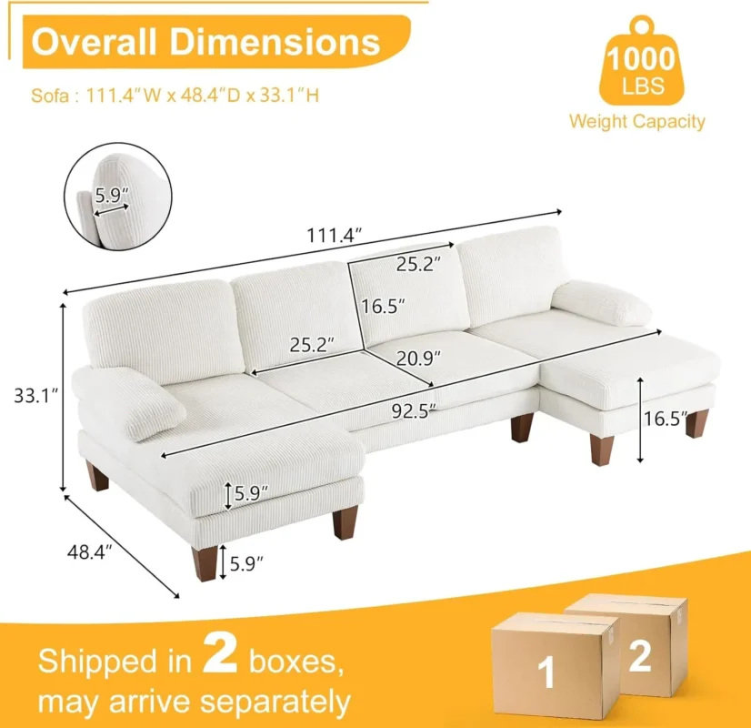 U-Shape Sectional Sofa Couch 111″ Modern 4-Seat Sofa with Chaises Corduroy Fabric Upholstered Couch with Wood Grain Legs